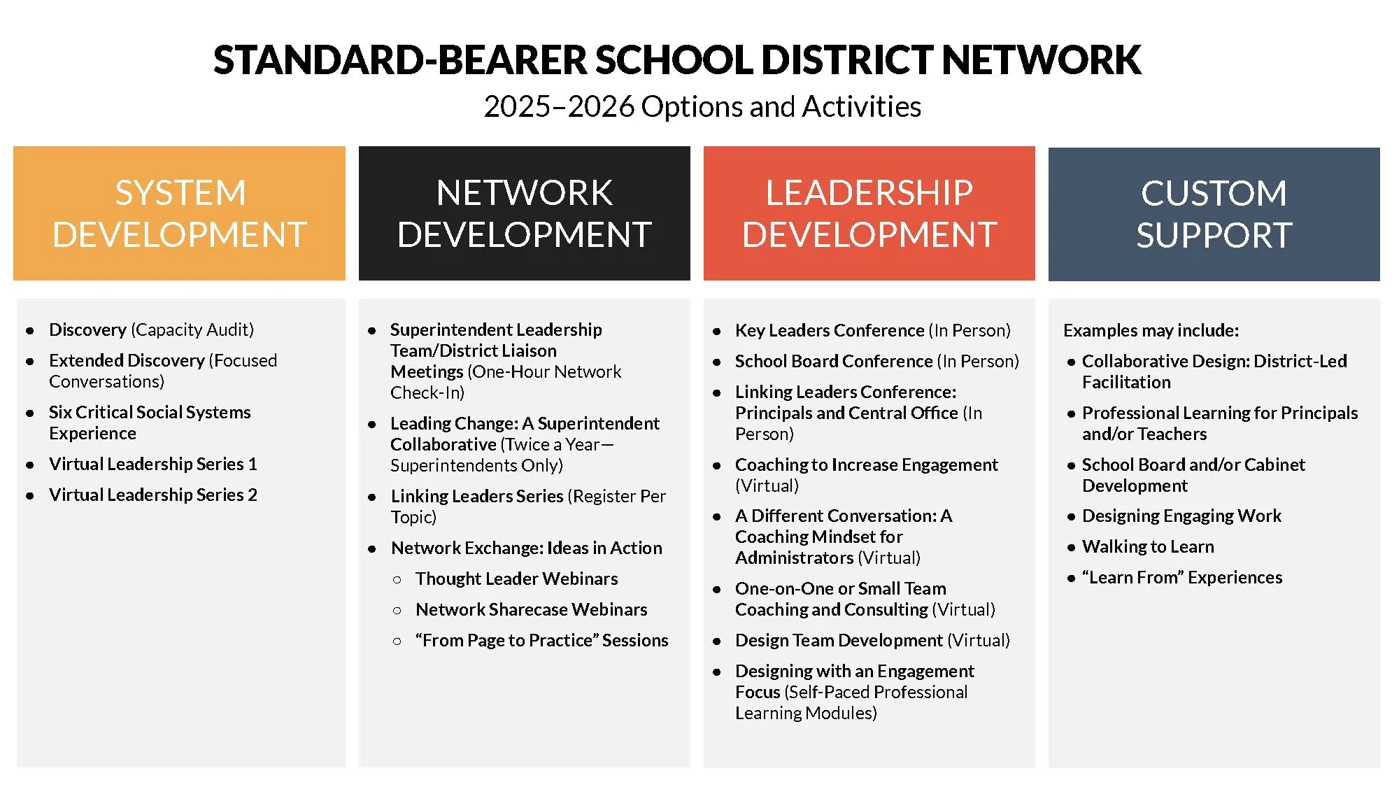 It is a network designed for school district leaders who are committed to a set of guiding principles, and who are seeking a safe place to think, reflect, and learn from one another using tools and resources that support building the capacity of their organizations to support continuous innovation and shared learning.